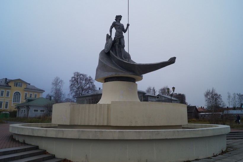 Некоторые думают, что этот памятник воздвигли в честь Петра Первого. На самом же деле это дар от Ленинградской области. Он символизирует становление города в качестве северного форпоста России. Мужчина, стоящий в лодке с копьем, как бы защищает север России от внешних врагов. По моему скромному мнению, это явно не венец скульптурного искусства.