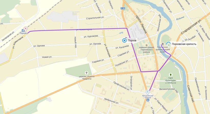 Добираться до Порховской крепости от автовокзала, как можно видеть на карте, раза в два быстрее, чем от железнодорожной станции. С общественным транспортом в городе туго: автобусных маршрутов всего два, и у самой крепости остановок нет, так что если для вас проблематично пройти 15-20 минут пешком, остается только ловить такси, стоимость которого может составить от 100-150 рублей и до бесконечности в зависимости от вашего обаяния и умения торговаться.