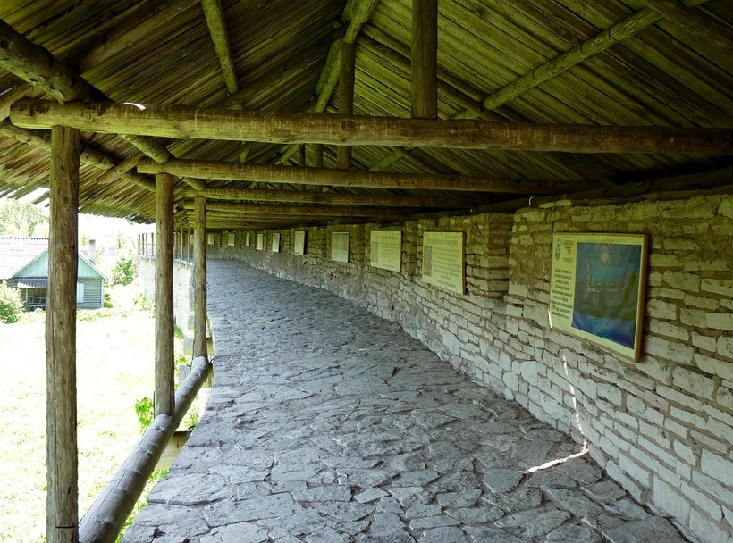 Чтобы посмотреть еще одну любопытную экспозицию, мне пришлось подняться на стену, при этом ступеньки настолько крутые, что я невольно задался вопросом, каково было взбегать по ним при обороне крепости. А прямо внутри настенного хода выставлены копии картин художника В.А. Кинкульского, на которых запечатлен другой Порхов. Крепость, фото которой первыми выдаются, если вы начнете искать виды города, далеко не всегда была его символом. Так на рубеже XIX-XX веков, когда границы Российской Империи успели существенно расшириться на запад, в Порхове царила мирная мещанско-купеческая идиллия.