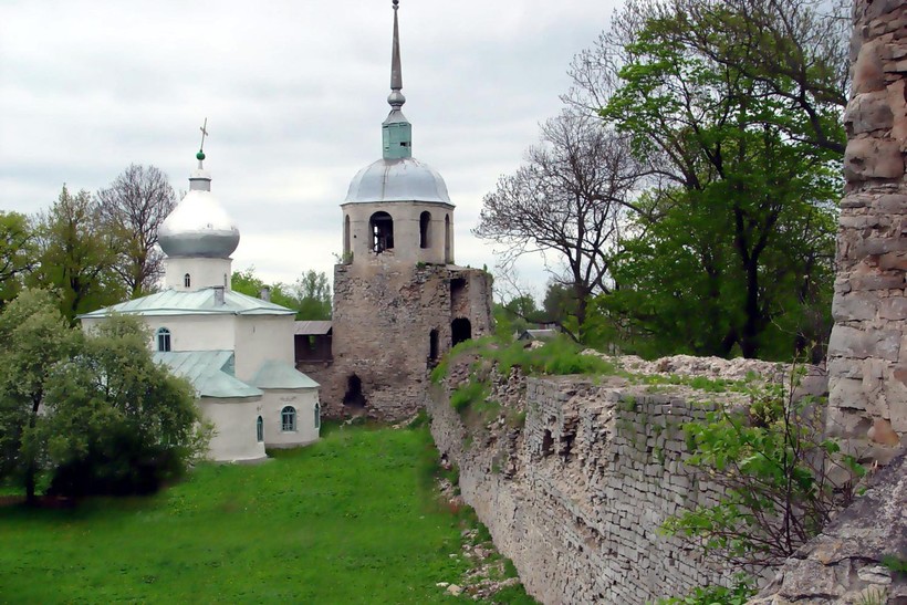 Порховская крепость относительно небольшая и, помимо стен, включает в себя четыре башни, из которых явно выделяется Никольская. Из грубого, посеревшего от времени известняка неожиданно вырастает шпиль колокольни, относящейся к стоящей неподалеку Никольской церкви. Любопытно, что в Порхове, как и в Изборске, церковь находится не в центре крепости, а рядом с одной из стен.