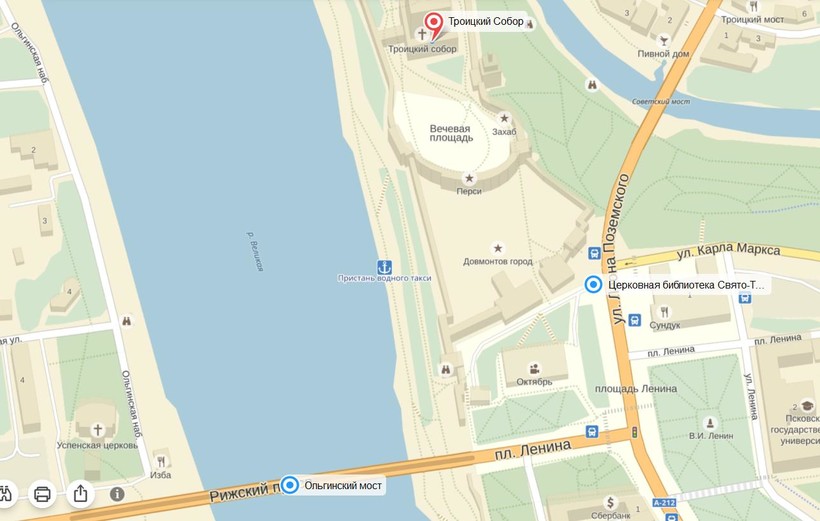 Чтобы добраться до Псковского Крома пешком или на автомобиле, ориентиром должен служить Ольгинский мост через реку Великую. Кром находится на правом берегу реки и, если стать к воде спиной, он окажется слева от моста. Адрес Троицкого собора — улица Кремль, 2/1.