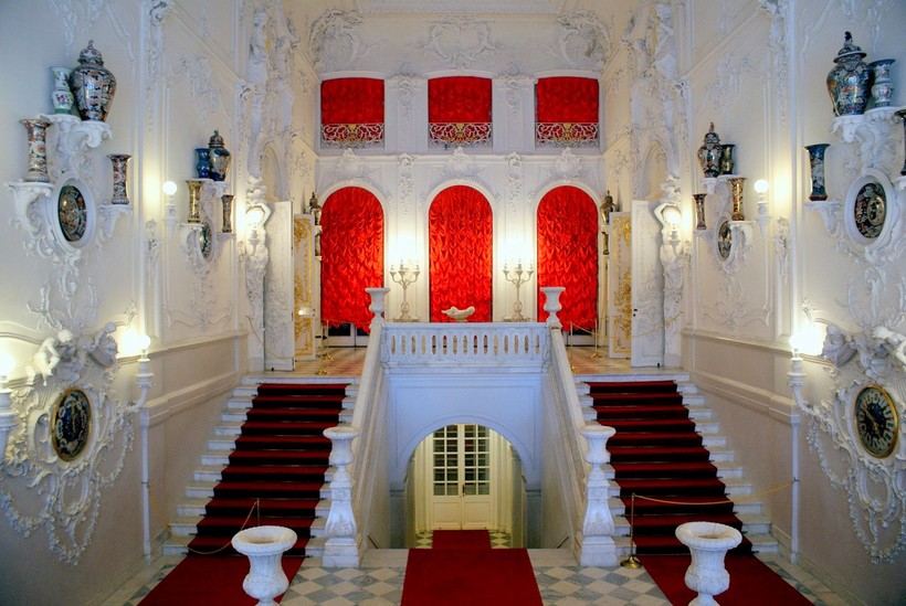 Первое что вас встречает — это Парадная (Главная) лестница дворца, изготовленная из белого мрамора. Это великолепное творение архитектора И. А. Монигетти. Она была выстроена на месте Китайского зала. Стены украшены вазами и блюдами из китайского и японского фарфора, также на стене висят большие часы и барометр.