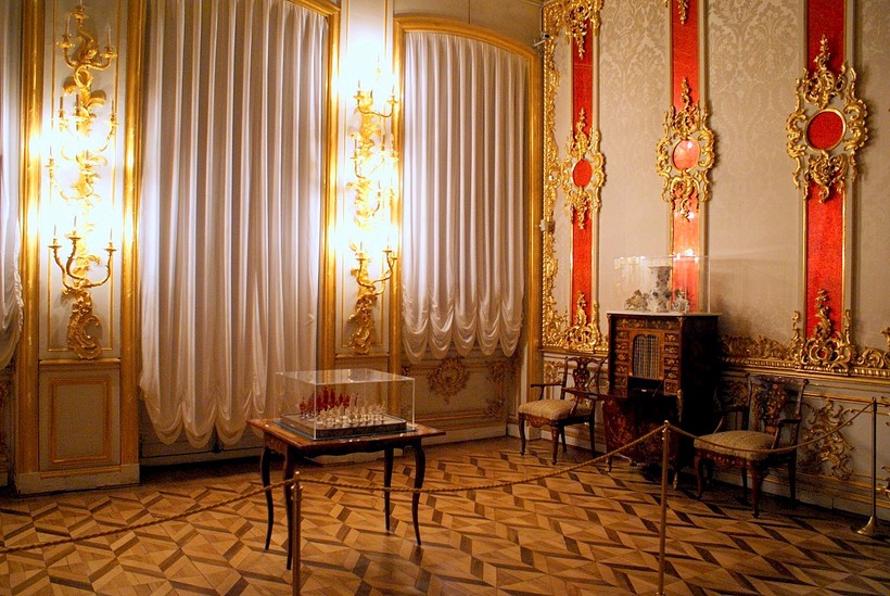 Восьмое чудо света — так её называют.Она должна была выполнять функции кабинета, где можно было уединиться, или, например, поиграть в карты. Янтарные панно были преподнесены прусским королем Фридрихом Вильгельмом I в качестве дипломатического дара Петру I. Янтарная комната заняла свое законное место не сразу.
