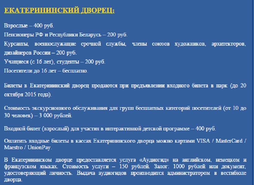 Для того чтобы попасть во дворец, в период с апреля по октябрь вам необходимо купить билет в парк.