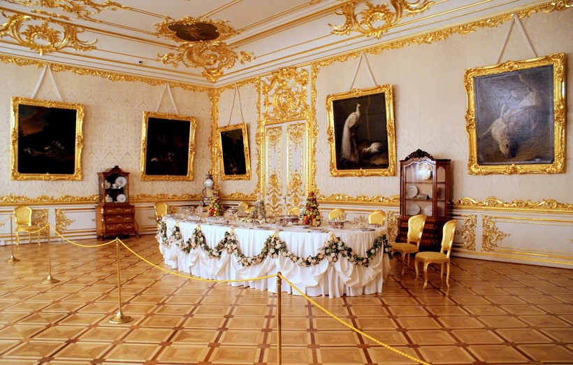 Белая парадная столовая служила для обедов императорской семьи. Здесь проводили официальные обеды, празднества с роскошной и сложной сервировкой столов, фонтанов из вина и шампанского. На стенах зала висят картины придворного художника И.Ф. Гроота. На них изображены сцены из охоты, натюрморты. Именно И.Ф. Гроот ввел такое направление в живописи как "охотничий натюрморт".
