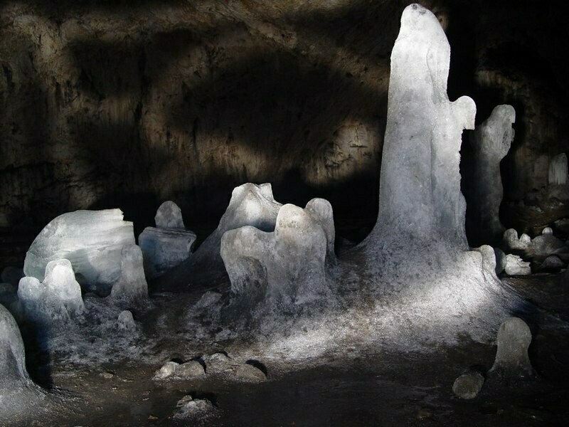 ЭТО ИНТЕРЕСНО! Рост сталактитов и сталагмитов продолжается до сих пор. Вода попадает в подземелье через щели в скале. Из-за близости реки и частых дождей в воздухе и почве много влаги. Холодный воздух в пещере быстро превращает влагу в ледяные скульптуры.