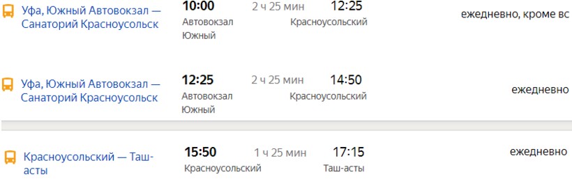Из Стерлитамака автобусы до Красноусольского отправляются ежедневно с 07:30 до 19:30 каждые 30–60 минут, время в пути — 1,5 ч. Чтобы успеть к автобусу Красноусольский — Таш-Асты в 15:50, нужно выезжать из Стерлитамака не позже 13:30.