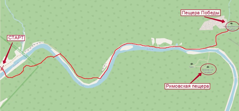 На последнем участке маршрута предстоит подъем ко входу в грот по горному склону на высоту 94 м (над уровнем Зилима). Ориентиром для начала восхождения является арка в скале на левом берегу реки.