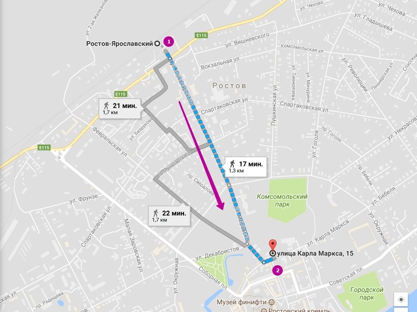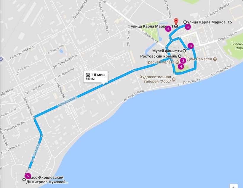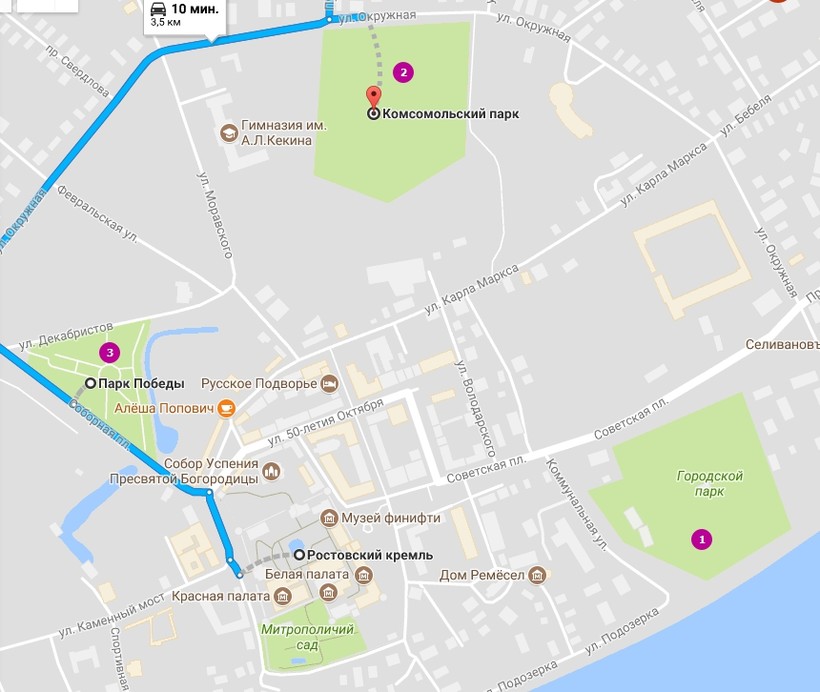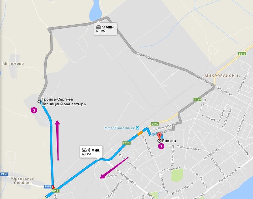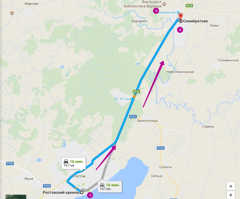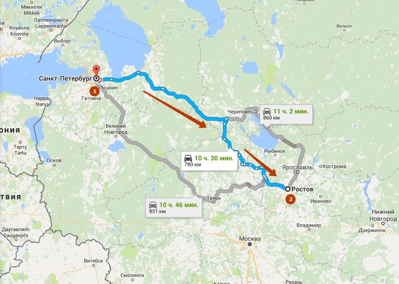 Я уже упомянула, что питерцы в данном путешествии в менее выигрышном положении, чем москвичи. Ведь путь ваш, как в сказке, не близок, а далёк. Придется отмахать от Петербурга (1) до Ростова (2) минимум 780 км. Хотя путешествие сюда от Северной столицы уже само по себе событие. Ведь можно посмотреть лежащие по пути города или устроить пикник, если погода будет к тому располагать.
