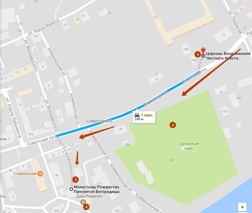 До центра города (2) от ж/д станции (1) всего чуть более 1 километра (если идти по ул. Луначарского).