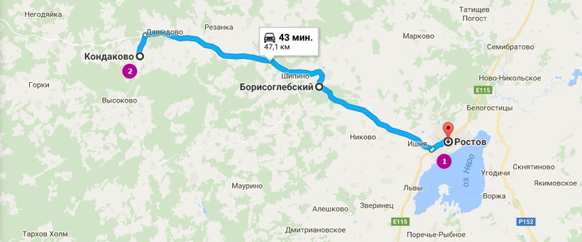 Находится он недалеко от Борисоглебского в селе Кондаково (2). От Ростова (1) в 47 км.