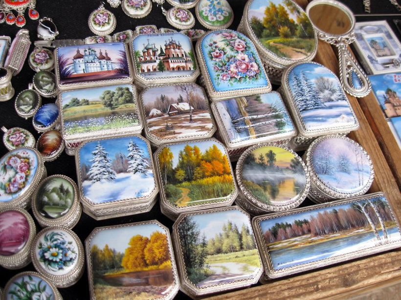 Во-первых, ростовская финифть. Украшения, церковные товары, шкатулки... Имейте в виду, что подлинные изделия (а не китайские аналоги) обычно отмечены клеймом производства. Покупать лучше в лавках при музеях или на предприятиях по изготовлению.