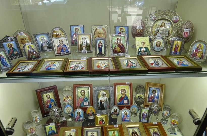 В церковных лавках можно приобрести иконы, литературу, мед, кагор, украшения.