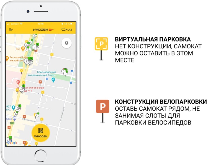 Whoosh позволяет бронировать электросамокат на 10 минут бесплатно, разблокировка транспорта осуществляется с помощью сканирования QR-кода. Завершить катание у Whoosh можно на виртуальных парковках, отмеченных на карте приложения.