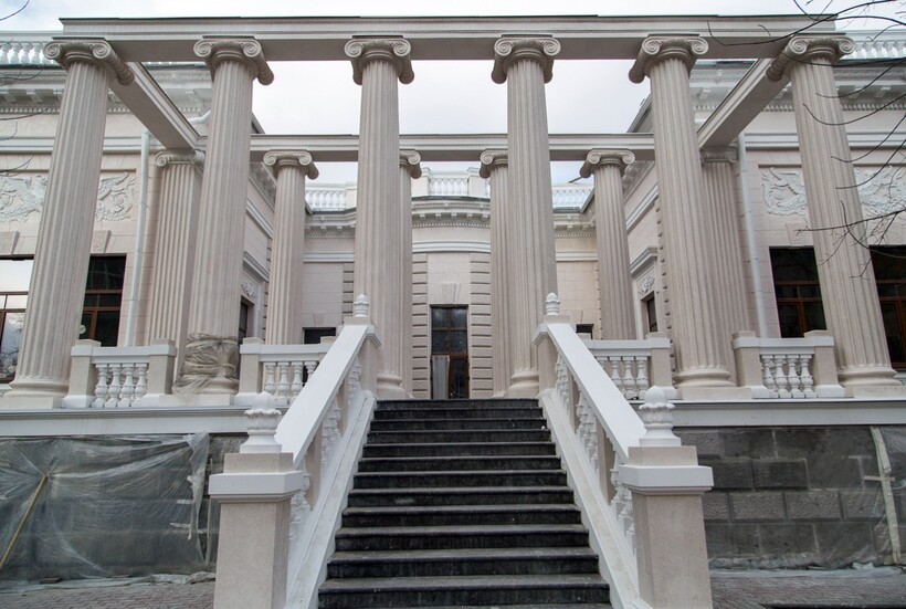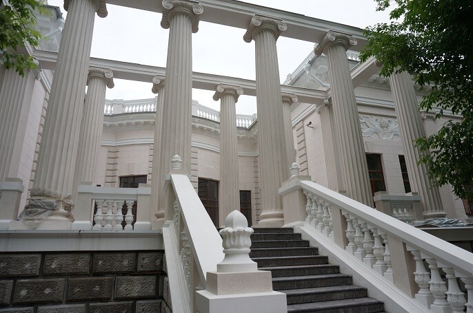 - Главный фасад украшает симметричная композиция с колоннами и четырьмя лестничными маршами, которые ведут к входу с обеих сторон. В центре расположены колонны в греческом стиле. Дом украшен множеством декоративных элементов: полуколоннами и карнизами. Цокольный этаж, оформленный накладкой на фасад из декоративного камня, завершается широким карнизом. Парадный вход акцентирован высокой лоджией с колоннадой и лестницей.