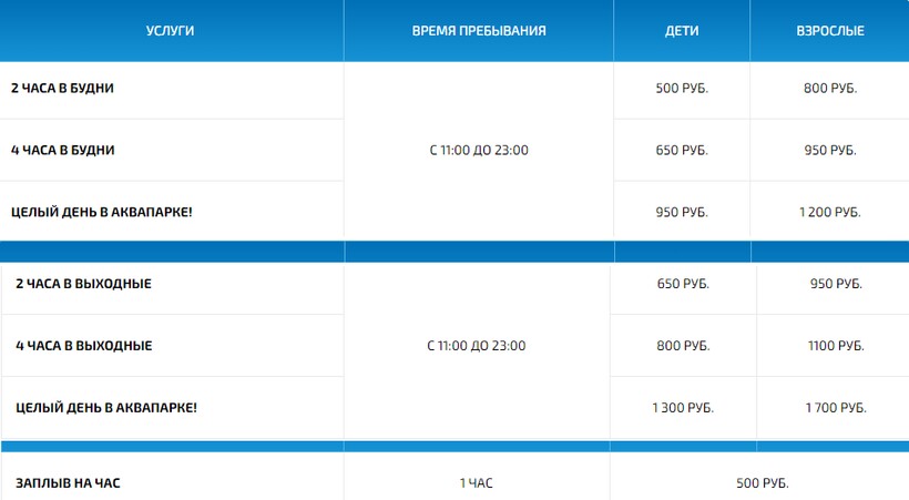 - выходные и праздничные дни: двухчасовое посещение аквапарка для ребенка — 650 ₽, для взрослого — 950 ₽; 4 часа для лиц 4–13 лет — 800 ₽, 14 лет и старше — 1100 ₽; без ограничения времени — 1300 и 1700 ₽.