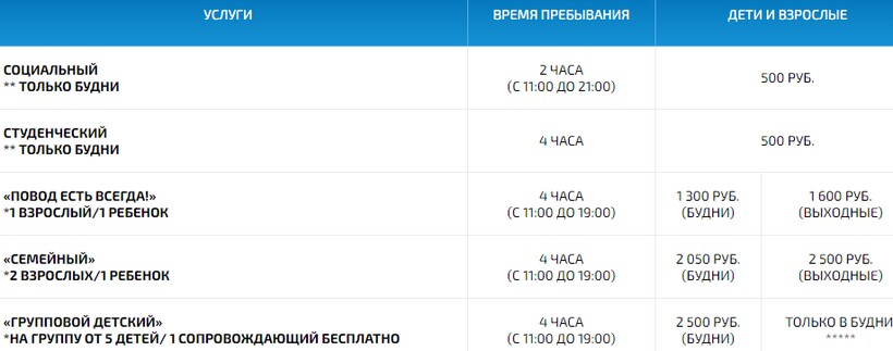 - будние дни: 2 часа пребывания для детей — 500 ₽, для взрослых — 800 ₽; 4 часа по детскому билету — 650 ₽, по взрослому — 950 ₽; целый день — 950 и 1200 ₽ соответственно;
