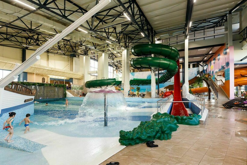 Аквапарк «Фэнтази» занимает правое крыло центра, в водно-развлекательном комплексе расположены экстремальные горки, 5 бассейнов (включая детский), кафе.