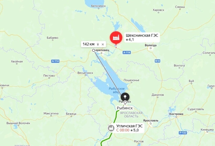 В результате замеров расстояния между устьем Мологи и Пошехоньем выяснили, что ширина Рыбинского водохранилища в километрах составляет около 80 км.