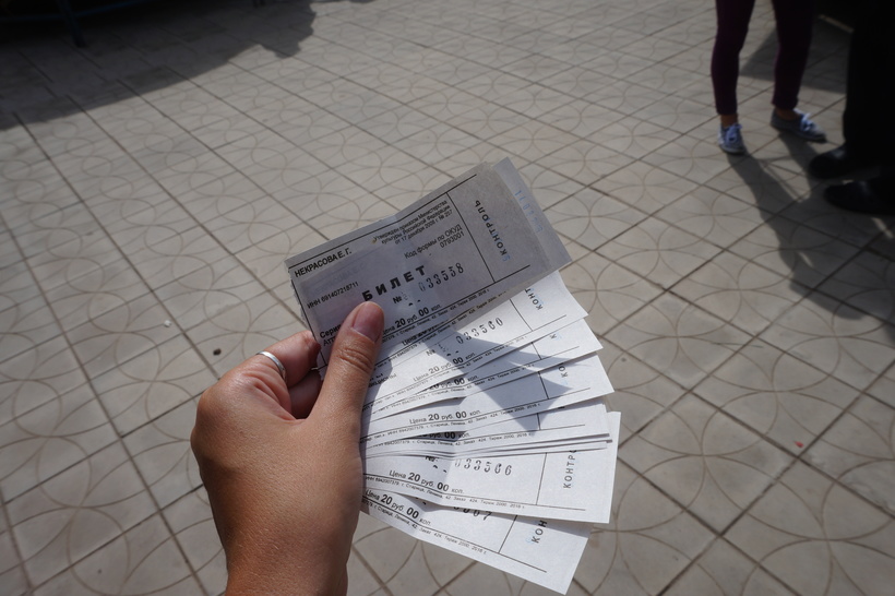 Стоимость таких каруселей — 80 рублей. Правда, в кассах все напечатанные билеты имеют номинал в 20 руб., поэтому вместо двух билетов мы получили вот такой вот ворох.