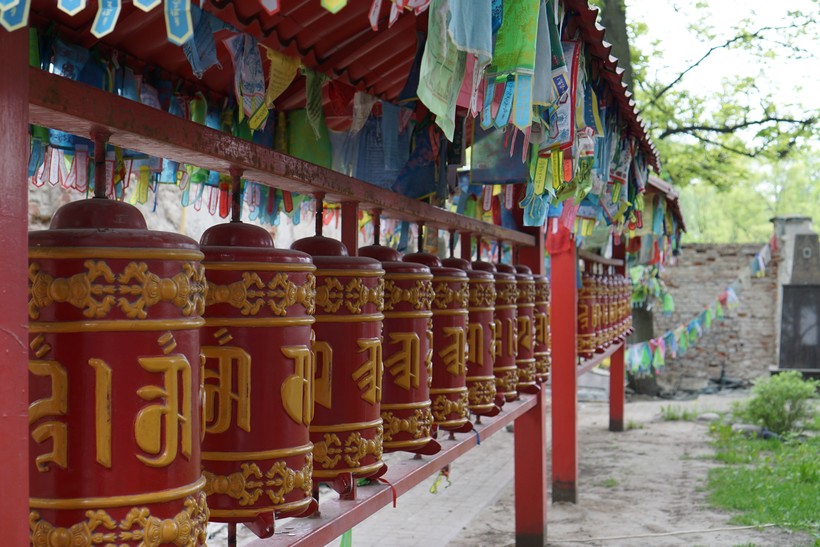 Первая интересность — это множество барабанов с надписями на тибетском языке по периметру забора в южной части двора. Проходить по ним следует по часовой стрелке или, как говорится в буддизме, по ходу движения солнца. Вы можете увидеть, как прихожане крутят эти барабаны, начиная свой круг по двору. Главное, делать это с добрыми мыслями в своей голове, закладывая смысл в каждое свое действие.