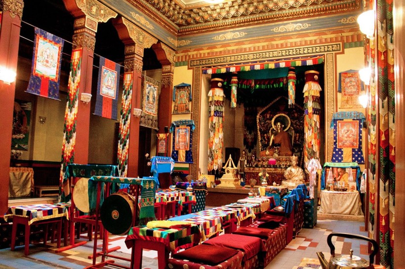 Иначе его еще называют дуганом. Это тот зал, войдя в который, вы сразу увидите величественного Будду, мирно смотрящего на каждого посетителя. У каждой из стен дугана расположены статуи различных божеств, а на самих стенах висят изображения разных созданий, символизирующих определенные вещи в буддизме. Алтарный зал поразил меня своей гаммой цветов — флажки на столбах чередуются по цвету, над Буддой располагается огромный зонт, защищающий его от бед и невзгод.