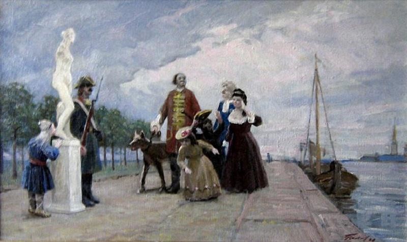 Вот так. А чтобы со статуей чего-нибудь недоброго не учинили, Пётр I повелел приставить к ней персонального часового. Галереи и дворец стояли прямо на берегу Невы, берег был усилен сваями, позже его увеличат вглубь реки.