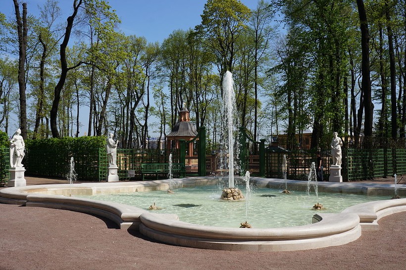 Также к числу первых работ относится создание гаванца (ковшеобразной гавани) и начало возведения фонтанов (первых в России). Водные каскады были декорированы скульптурами в виде сцен из Эзоповых басен (у каждого находилась табличка с разъяснением произведения). Их создание послужило для наименования бегущей близ речки — Фонтанки, которую для удобства водного сообщения в 1705 году перегородили плотиной.
