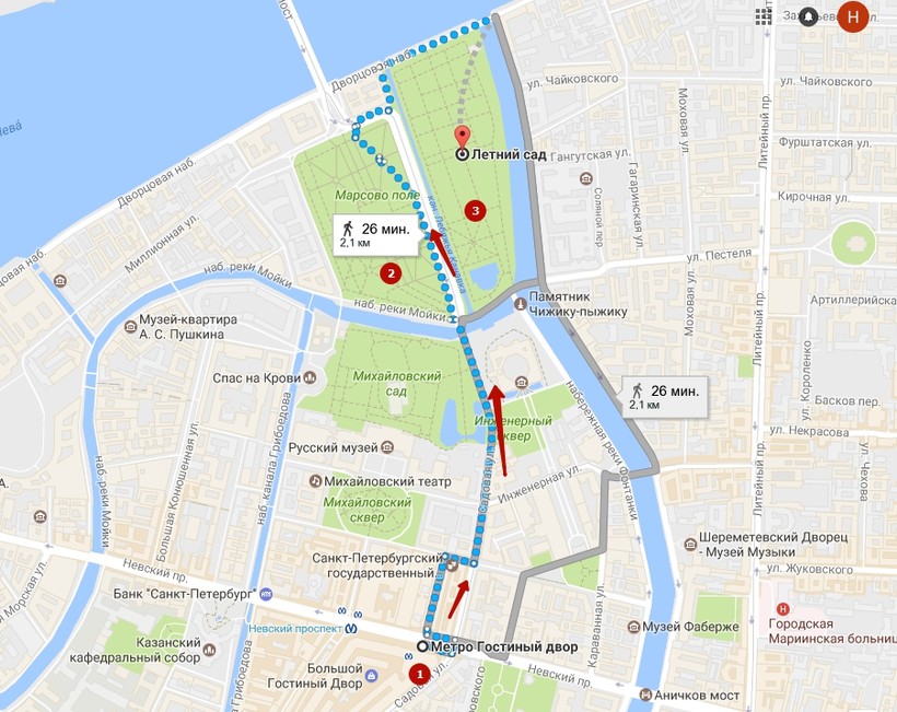 Надо выходить на станции «Гостиный двор» (1), и перейдя по подземному переходу Невский проспект, направляться по Садовой улице (она мне также очень симпатична) до набережной реки Мойки. Слева от вас будет знаменитое Марсово поле (2), а справа — Летний сад (3).