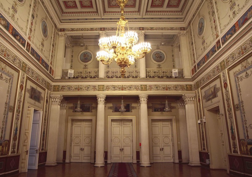 Парадные залы были украшены в стиле позднего классицизма. На втором этаже две анфилады в своём пересечении образовывали помещение в виде ротонды, за которым находился Квадратный (Помпейский) зал с Овальными столовой и гостиной.