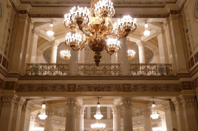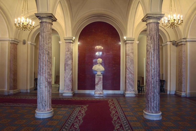 Отмечу, что стены здесь были облицованы не мрамором, а песчаником, что служило хорошей звуко- и теплоизоляцией. Для внутреннего убранства был характерен переход от канонов классицизма к эклектике. В итоге Мариинский дворец стал вторым ансамблем в Петербурге (после интерьеров Брюллова в Зимнем дворце), созданным в подобной манере.