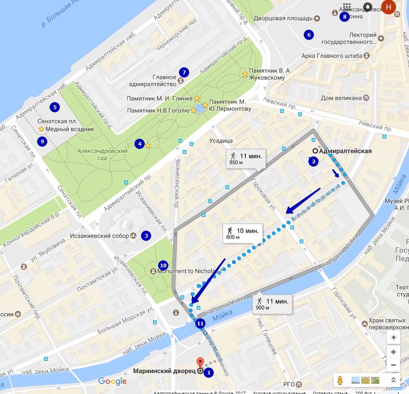 Стоит лишь доехать на метро до станции «Адмиралтейская» (2) и несколько минут пройти пешком, как я показала на карте. Сразу отмечу: рядом будут находиться и другие значительные достопримечательности Санкт-Петербурга, на которые я советую вам обратить внимание. Это Исаакиевский собор (3), Александровский сад (4), Адмиралтейство (7) (со стороны Невы в нём недавно открыт уютный маленький храм Спиридона Тримифунтского), Сенатская (5) и Дворцовая (6) площади, Эрмитаж, Александровская колонна (8). На Сенатской площади полюбуйтесь памятником Петру Великому, который известен нам как Медный всадник (9). По-моему, фото на его фоне необходимо каждому гостю Петербурга!