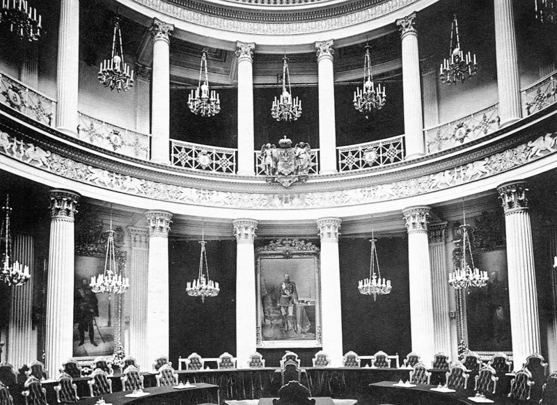 Интерьеры при этом несколько видоизменили (проект Л. Л. Петерсона). В здании с 1893 года появляется электричество, сменившее освещение свечами. В зале-ротонде проводились совещания Государственного совета, для руководителя которого был отдан кабинет, некогда принадлежавший герцогу Максимилиану. Концертный зал теперь подслушивал замыслы министров, а Овальный — решения Департамента гражданских и духовных дел. Кстати, мой любимый художник И. Е. Репин создал полотно, на котором запечатлел празднование столетия Государственного совета (1901 год), прошедшее в зале-ротонде.