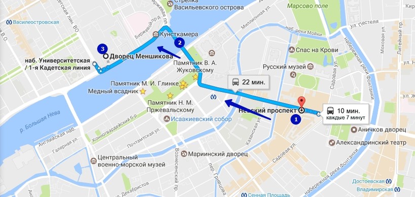 если пешие прогулки не для вас, то едем до метро «Гостиный двор» (выход на канал Грибоедова) (1). Отсюда на троллейбусах № 1 или № 10, а также на автобусе № 7 (садиться на стороне метро) переезжаем через Дворцовый мост (2) до остановки «Университет». Выходим у здания Двенадцати коллегий и оказываемся рядом с дворцом (3).