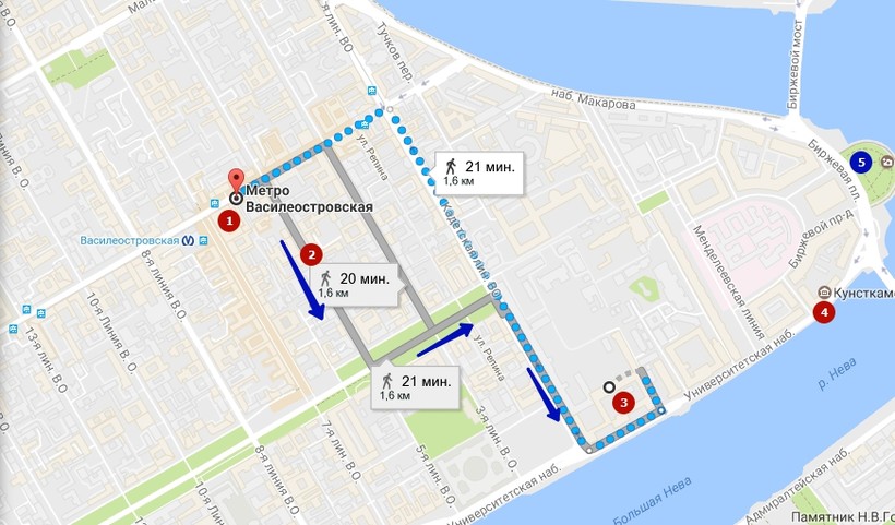 первый путь — от метро «Василеостровская» (1). По выходе из метро пройдитесь по старым улицам Васильевского острова, (непременно включите в прогулку 6-ую пешеходную линию (2) — очень приятное место). Вы выйдете на Университетскую набережную, как показано на карте, где и находится Меншиковский дворец (3). (Адрес: Университетская наб., 15.) При этом обратите внимание, что рядом расположены знаменитая Кунсткамера (4) и Стрелка Васильевского острова (5), на которой непременно полюбуйтесь на Ростральные колонны и здание Биржи.