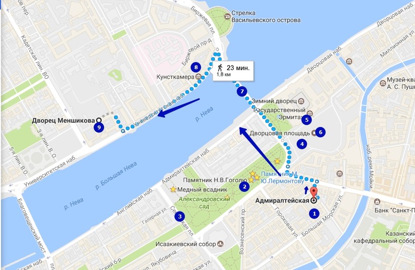 второй путь проляжет от метро «Адмиралтейская» (1). По ходу от неё вам предстоит столкнуться с потрясающими местами: Александровский сад (2), Сенатская и Дворцовая площади (3 и 4), Адмиралтейство, Александровская колонна (6), Государственный Эрмитаж. По Дворцовому мосту (7) вы перейдёте через Неву к Стрелке Васильевского острова, полюбуетесь панорамой на Петропавловскую крепость и, миновав Кунсткамеру (8), подойдёте к дворцу (9).