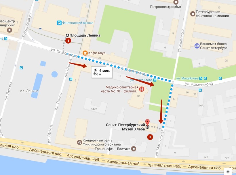 Доезжаете до станции «Площадь Ленина» и выходите в сторону Финляндского вокзала. После нужно пройти в направлении, указанном на карте.