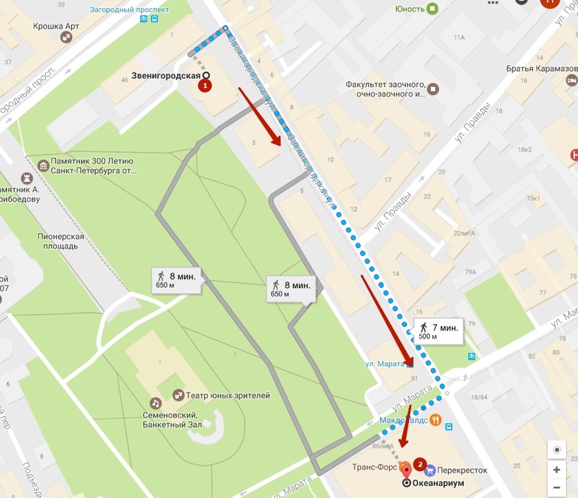 Океанариум расположен очень удобно для посетителей — в центре Санкт-Петербурга по адресу: ул. Марата, 86. (на пересечении улиц Марата и Звенигородской). Сюда вы доезжаете на метро (просто, быстро, без пробок) до станции «Звенигородская» или «Пушкинская» (выход на Звенигородскую) (1).