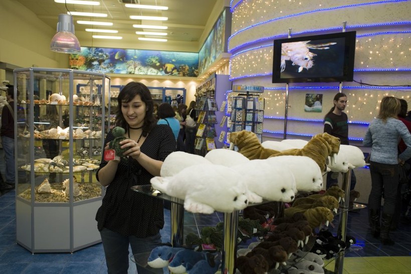 Приложив такую заморскую гостью к уху, вы сможете услышать шум прибоя, шепчущего свои легенды где-то на другом конце света. Также здесь есть украшения для ваших домашних аквариумов, и литература для правильного содержания питомцев с яркими плавничками. Те, кто захочет внести морскую нотку в интерьер квартиры, также сможет найти здесь нечто по душе: панно, авторские изделия, настенные украшения… Мне особо понравились милые игрушки, но мы с дочкой мужественно взяли себя в руки и на сей раз оставили тюленят лежать на полках.