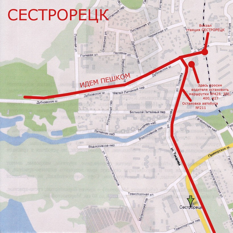 Автобусы и маршрутки до Сестрорецка отправляются от станций метро «Черная речка» (№211) и «Старая деревня» (№305).