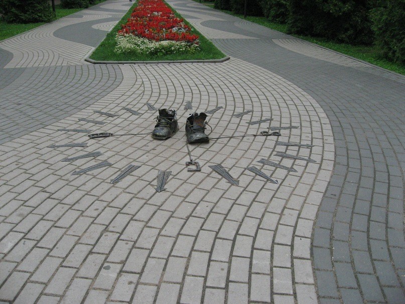 Вокруг ботинок расположены стрелки компаса, символизирующие, что любой житель или гость города на Неве может сам выбрать свой жизненный путь.