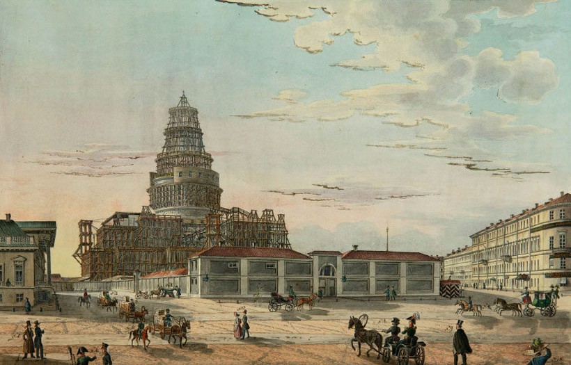 Стены и колонны храма выложили кирпичом и укрепили металлоконструкциями. При установке мощного центрального купола выяснилось, что Стасов допустил в расчётах оплошность, и колонны, принимавшие на себя нагрузку, треснули. Мне показалось весьма необычным наказание проштрафившегося мастера. Судите сами: Николай I просто-напросто продержал его день на гауптвахте, отстранив от дел. На мой взгляд, не карательная мера, а настоящий выходной.
