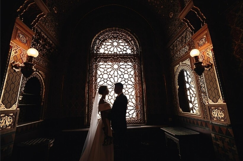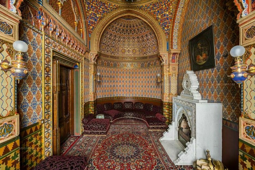 - Будуар — дамские покои в мавританском стиле: расписан восточным орнаментом, окно украшает узорчатая деревянная решетка.