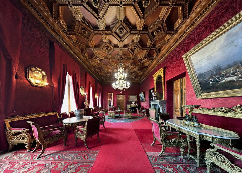- Малиновая гостиная — в традициях Итальянского Возрождения (XIV–XVI вв.): с люстрой из муранского стекла и картинами из коллекции великого князя Владимира.