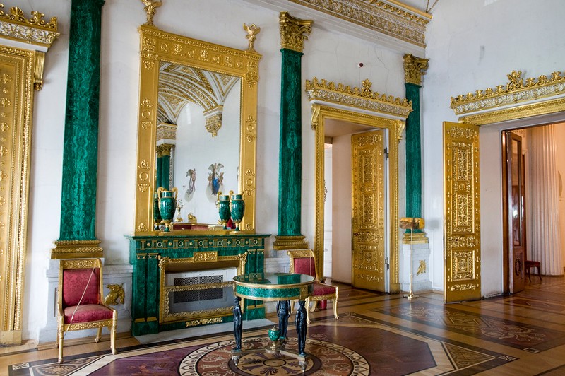 Малахитовая гостиная была создана для жены Николая I. В этом зале много малахита из рудников братьев Демидовых. Перед скульптором стояла задача практически государственной важности: он должен был продемонстрировать мощь и богатство русских земель, найти тот природный материал (минерал или камень), который бы олицетворял Россию. Зеленый цвет малахита наилучшим образом подчеркнул статус Российской империи. Малахит является символом жизни и роста.