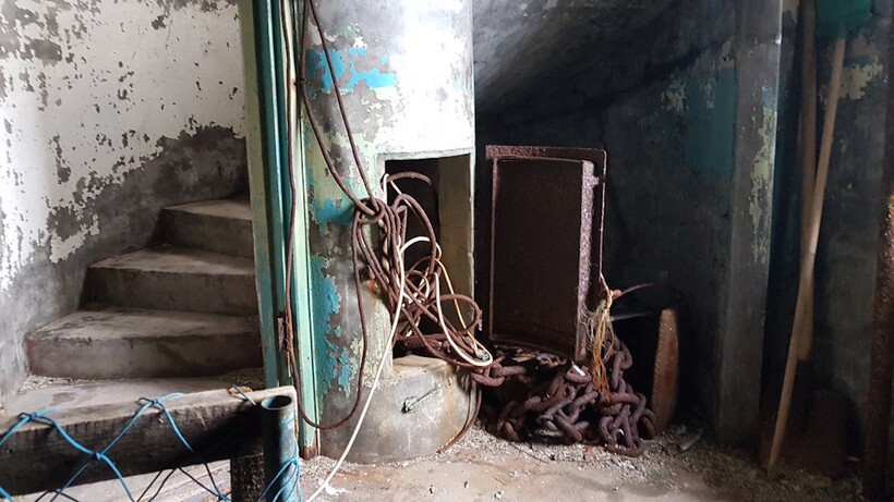 Сооружение внутри достаточно просторное. На нижнем, цокольном, этаже находились дизельная и аккумуляторная. Пристройку и первый этаж занимали кухня и склад с продуктами.