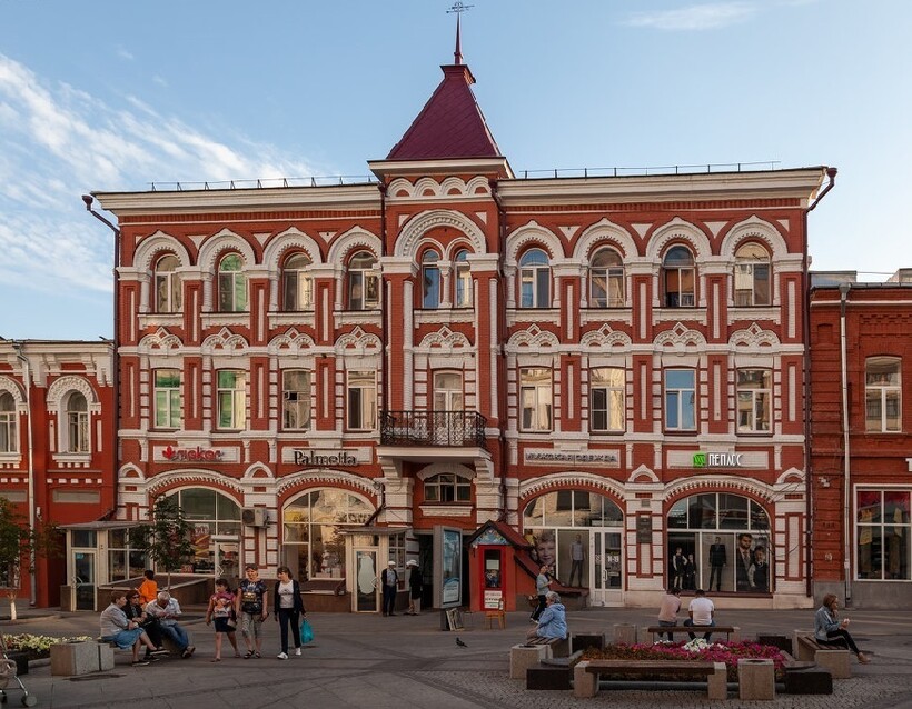 - дом купцов Сидоровых, созданный в 1870-х годах с элементами русско-византийского стиля и увенчанный шпилем, фасад украшен орнаментом и узорами.