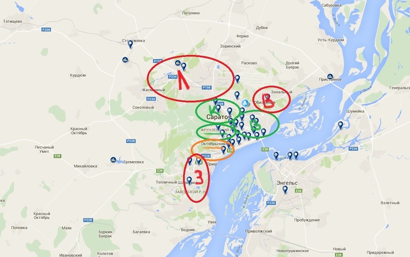 Центральные районы: Волжский, Кировский, Фрунзенский. Отдаленные районы: Заводской и Ленинский, там инфраструктура развита не так хорошо и достопримечательностей там тоже немного. С другой стороны, цены на жилье там значительно ниже. Всего в Саратове 6 районов. Октябрьский связывает центр и Заводской район. Поселок Юбилейный тоже относится к Волжскому району, но жить там неудобно, так как слабо развита инфраструктура, поэтому зон с пометкой «В» (Волжский) две, зеленая — это прибрежная часть, красная — Юбилейный и Зональный поселки.