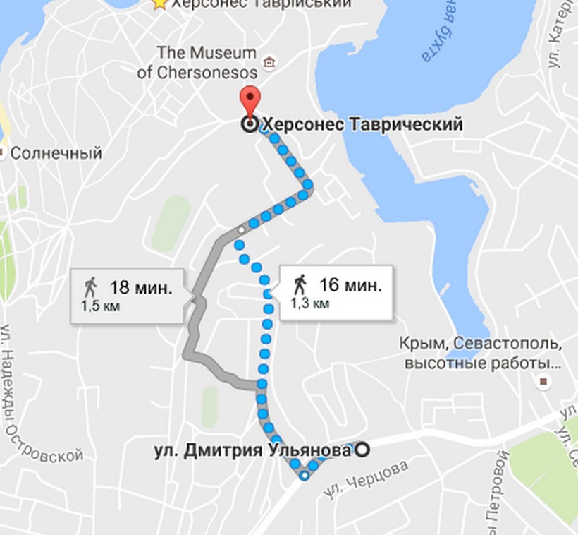 На улице Ерошенко необходимо повернуть направо и пройти еще около пятисот метров до ворот заповедника «Херсонес Таврический», который и расположен на берегу этой тихой и уютной бухты.