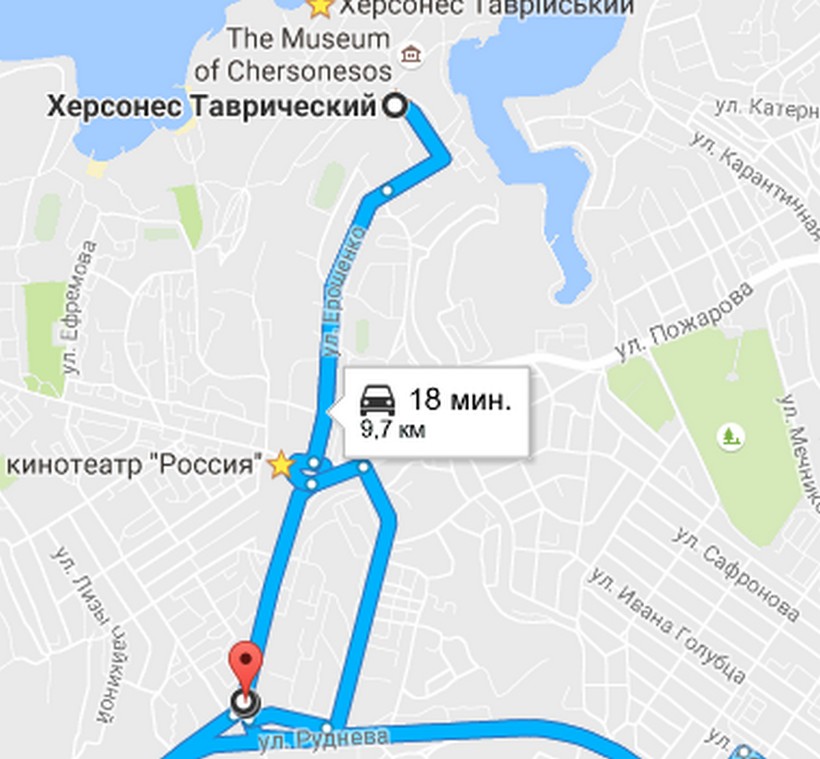 На правый берег Карантинной бухты, где расположен заповедник «Херсонес Таврический», добираться придется через площадь «Пятидесятилетия СССР», от которой начинается улица Ерошенко.